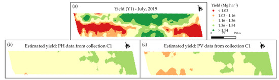 (a) Harvest yield data Y1 (July 2019); (b) yield estimated with PH-C1; (c) yield estimated with PV-C1.