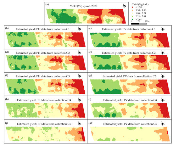 (a) Harvest yield data Y2 (June 2020); (b) yield estimated with PH-C1; (c) yield estimated with PV-C1; (d) yield estimated with PH-C2; (e) yield estimated with PV-C2; (f) yield estimated with PH-C3; (g) yield estimated with PV-C3; (h) yield estimated with PH-C4; (i) yield estimated with PV-C4; (j) yield estimated with PH-C5; (k) yield estimated with PV-C5.