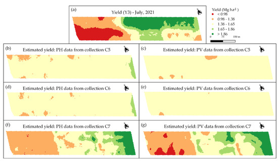 (a) Harvest yield data Y3 (July 2021); (b) yield estimated with PH-C5; (c) yield estimated with PV-C5; (d) yield estimated with PH-C6; (e) yield estimated with PV-C6; (f) yield estimated with PH-C7; (g) yield estimated with PV-C7.