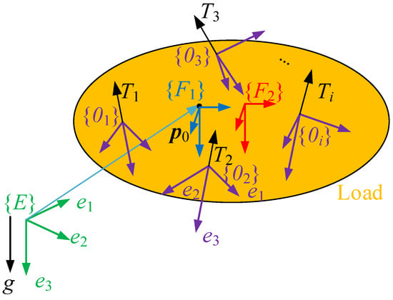 To study the dynamics of the AVA composed of n sub-aircraft, we first define the coordinate frames of the system. The world frame is expressed by , whose z-axis coincides with the direction of gravity. We attach a frame to the entire system. The origin of is the COM of the entire AVA. We also define a frame attached to the load. The origin of is the COM of the load. Note that and are parallel and reflect the orientation of the load but have different origins. We will show later that both and are necessary for the model. To each sub-aircraft i, we attach a body-fixed frame , . The dynamics of the entire system can, thus, be modeled via the Newton–Euler method as []: