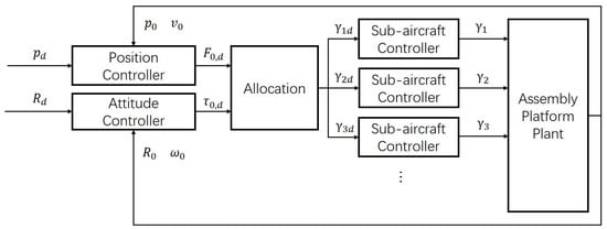 For the six-DOF AVA, the overall controller is composed of an independent position controller and an attitude controller. The output of the position controller is the force vector , and the output of the attitude controller is the torque vector . The overall control architecture is shown in Figure 3. In the outer loop, the force and torque generated by the position control and attitude control need to be mapped to the thrust vector of the sub-aircraft, which is then tracked by the attitude controller of the sub-aircraft.