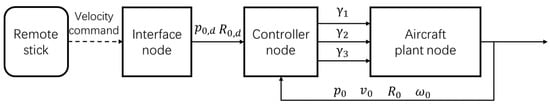 The dynamics of each sub-aircraft are independent of the dynamics of the overall payload system. This is different from the dynamics of most aerial transportation systems, which rely on cables []. For an aerial transportation system with cables, the dynamics of each sub-aircraft is coupled with the dynamics of the payload platform. In contrast, the entire dynamics of the AVA can be expressed by two subsystems: a slowly varying system expressed by (1) and (2) and a fast time-varying system expressed by (3). It is easy to adapt a flight controller for a rigid aircraft to our AVA system, regardless of the number and placement of the sub-aircraft in the AVA.