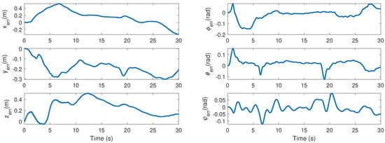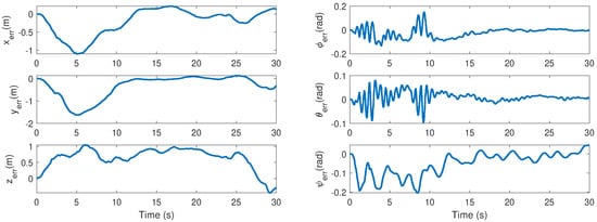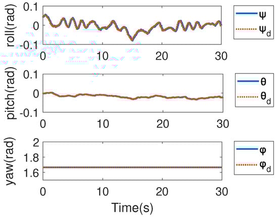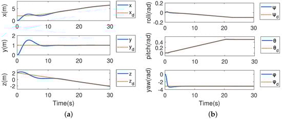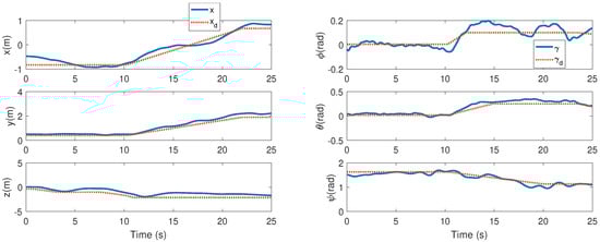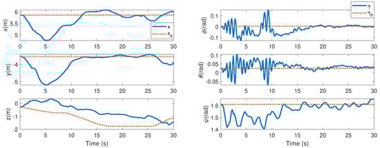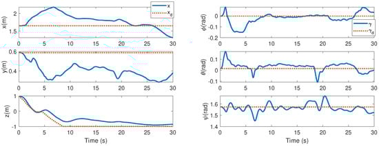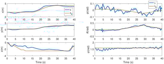The simulated tracking of the position and attitude of the AVA is shown in Figure 5. There was an initial position error and an initial attitude error. The initial error for the yaw angle of the payload platform was almost 180°, which means that the attitude error was almost a maximum. As shown in the figure, the time-varying reference attitude trajectory was independent of the reference position trajectory. The controller simultaneously tracked the reference position and attitude of the AVA. The attitude of the payload platform was adjusted when approaching the target position from the initial position.