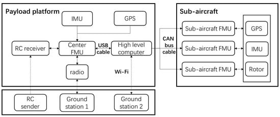 Figure 7 shows the architecture of the hardware system developed for the AVA prototype. Rather than using wireless communication, the computer on the payload platform and the autopilot of each sub-aircraft were connected by a CAN bus to increase the reliability and real-time performance. This also enhanced the expandability of the system.