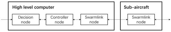 Figure 8 shows the software system developed for the AVA prototype. It was based on the ROS framework. The Swarmlink nodes handled communications among the high-level computer and multiple sub-aircraft. The Decision and Controller nodes were the planning and control modules. The Controller node was based on the controller proposed in this paper.