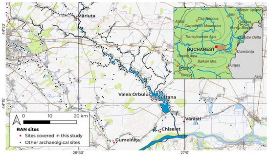 The targeted area is located in the southeast of Romania, Călărași County, Muntenia Region, one of the most intensively investigated regions in terms of Chalcolithic sites in the Northern Balkans. Geographically, we are dealing with two micro-regions, and the sites investigated are spread across the Mostiștea Basin and Danube Valley, from the cities of Oltenița to Călărași (Figure 1).