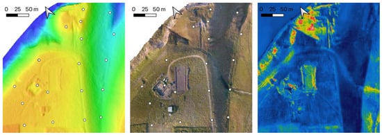 The specifications of the RGB sensor are not as good as the DJI Mavic 2 Pro, but the system still allows the creation of orthophotos and DEMs with reasonable accuracy (Figure 2 left, middle). The white dots in this image represent the ground control point (GCP) locations. The use of these points is discussed later in this paper. In combination with the new thermal sensor, simultaneous true colour (RGB) and thermal images can be obtained from the study area. Although the resolution of this sensor is limited to 1600 × 1200 pixels, fixing both cameras into one camera body still allows the use of the resulting thermal images in combination with conventional true colour 3D modelling (Figure 2 right). Data processing typically results in an orthorectified projection of pseudo-thermal values presented in a false colour composite.