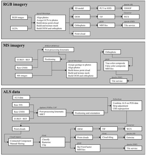 The ALS data processing contains three steps. At first, the GNSS readings from the sensor on board the platform should be corrected based on reference data using post-processed kinematic (PPK). Then, the GNSS data for the ALS are processed following the same methodology as the MS data, as described above.