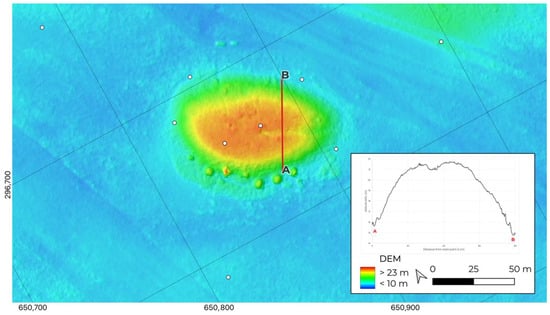 Chiselet site: Detailed DEM of the tell settlement with an illustrative profile. The white dots represent the locations of the GCPs. The letters ‘A’ and ‘B’ on the map correspond with the start and end of the profile respectively (coordinates in EPSG:3844).
