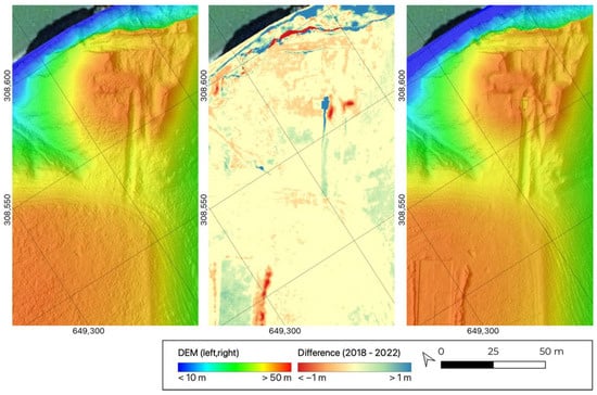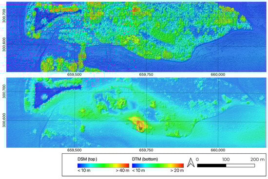 Both UAV-based ALS and photogrammetry allow the creation of fast and accurate 3D models of the covered topography. While UAV-based photogrammetry allows the creation of spatial datasets with a very high resolution for relatively small areas, UAV-based ALS can cover considerably more extensive areas. Although the point density of the used ALS system is significantly lower than the values obtained with photogrammetry, the density is still considered high compared to most nationally provided conventional ALS point clouds (e.g., 16 point/m2 in Flanders, Belgium, 10 points/m2 in The Netherlands, and so forth [73]. Thanks to PPK GNSS and SBET, no GCPs are required, which limits the time required for on-site flight preparations. However, the sensor only results in a point-based representation of the surface, and no colour information is added to the data set.