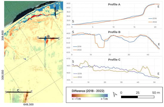 The tell settlement has also been covered by a series of images with a GSD of less than 2 cm (Figure 9). For completeness, an illustrative cross-section was added to this figure, demonstrating a simple example of the usage of these DEMs. As with other flights for this project, an extensive series of GCP have been measured in the area, facilitating the spatial alignment of the different flights and the georeferencing of the data in the Pulkovo 1942(58)-Stereo70 coordinate reference system (EPSG:3844).