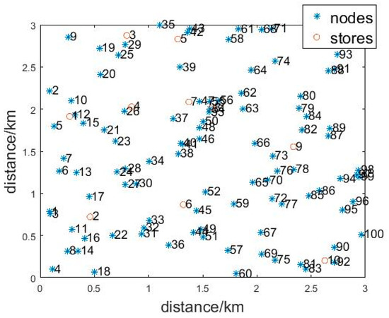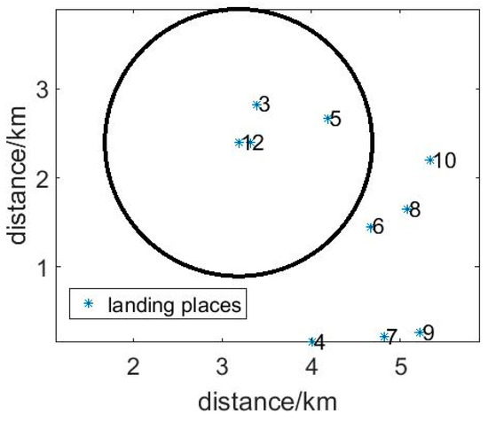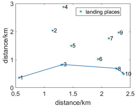 In Figure 4, the ten stores were marked with red circles and one hundred possible landing places were marked with blue crosses. The mission destinations were some of the landing places.