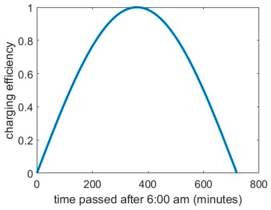 In our study, we adopted the time-dependent solar radiation model called the S. Kaplanis’s model from [5], shown in Figure 3 (the Y-axis label was replaced with charging efficiency, as defined in this paper):