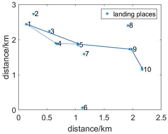 We defined the problem formally as follows: given a geographical (local) map with marked n locations (called nodes): where is the start node and is the destination, and are possible landing places on the geographical map. At first, a graph was generated to describe the reachability relation between the nodes . represents all the edges that follow where is the length of edge , and is the maximum one nonstop flying distance of the UAV with its energy storage maximally charged. Then, the SPU path planning problem could be described as the mission time minimization problem with Equation (1) when graph and distance were chosen.