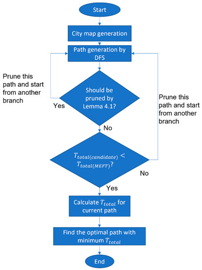The algorithm presented in this section was a simple globally optimal algorithm (GOA) for solving the problem described in Section 3.2. Namely, the solution to this problem was just a combination of the path traverse algorithm with a depth first search (DFS) and the charging time assignment (CTA) algorithm. The CTA algorithm was necessary in the case that a UAV was unable to reach the destination and needed to find the next landing place for charging before completing the mission.