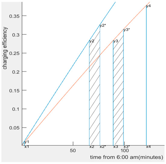 where represents the minimum charging efficiency for all charging places on a local city map, represents the maximum charging efficiency for all charging places and represents the total time to charge the battery from empty to a fully charged state when the charging efficiency was .