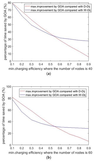 The following diagrams describe when H was fixed, the minimum charging efficiency (MCE) in the local city map ranged from 0.1 to 0.9 (nine points total) and the percentage of time saved by the GOA algorithm compared with different kinds of Dijkstra algorithms. The improvement was measured using Equation (28), and we only showed the maximum improvement.