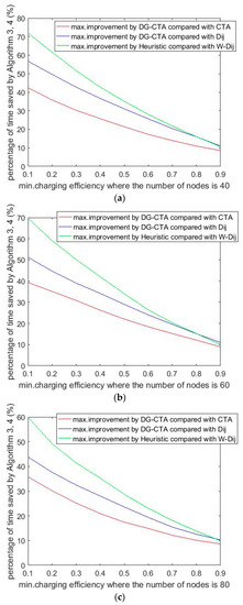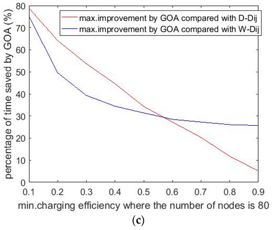 (a–c) Maximum improvement by the GOA, where the number of nodes were 40, 60, and 80 (in Figure 10, max. improvement represents the maximum improvement an algorithm could achieve, and min. charging efficiency represents the minimum possible charging efficiency in the city map).