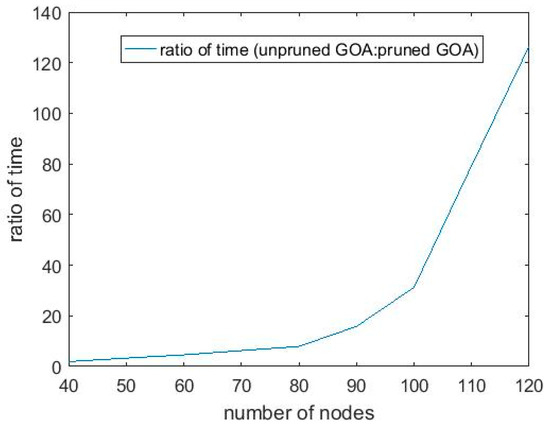 Assuming that represents the averaged total mission time for the pruned GOA (Algorithm 2), and represents the Dijkstra algorithm applied in [2], the percentage of time saved by the GOA algorithm was: