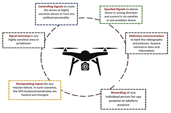- There are certain areas where drones may face signal jammers and, later, can be controlled for a cyberattack. Thus, drones must have some sort of filter that may detect if there is any signal jammer nearby.