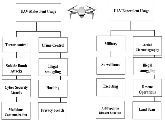 | Malware issue | In various cases, it has been observed that these UAVs are generally connected and controlled via cell phone or any sort of remote control. These techniques are, thus far, not safe [43] and, therefore, the UAVs are easy to be hacked using a reverse-shell TCP payload that can be injected into UAV memory. Furthermore, this leads to installation of malware over UAVs automatically. |