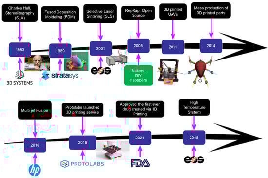 Throughout the last decade, a diverse range of investigations was performed regarding additive manufacturing (AM) in the aerospace sector. AM is the process of creating an object by building it one layer at a time, it is the opposite of conventional subtractive manufacturing. Industry implementation of AM technologies increased continuously in recent years. This is due to the great design freedom and the continuous cost reduction [1,2]. The parts are fabricated directly from CAD files. Recently, AM expanded nearly to all the industrial activities, including aerospace, automotive, medical, pharmaceutical, and civil engineering sectors [3,4,5]. With the emergence of AM came the idea of printable UAVs enabling the production of a wide range of designs and geometries. Currently, this manufacturing technique is being used in aerospace to produce engine and turbine parts, as well as parts for cabin interiors [6]. A timeline of the inventions, development of AM techniques, and first applications towards engineering are shown in Figure 1.