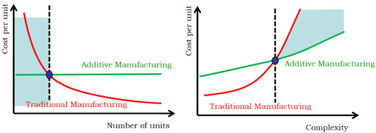 AM techniques eliminate the need for tooling, then the manufacturing cost per unit for AM UAVs becomes relatively constant, as shown in Figure 2. On the other hand, the cost per unit for AM increases with the complexity, but the rate of increment is lower than the traditional manufacturing. Then, clearly the AM is a very competitive manufacturing process for a reduced number of units to be manufactured when the complexity of the part is high [7].