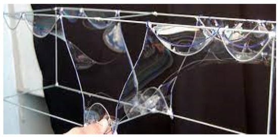 Mathematically, a minimal surface is a surface that locally minimizes its area, and hence has zero mean curvature. Minimal surfaces are those considered to contain minimum potential energy and are the most stable [21]. A physical model to see the formation of a minimal surface can be made by dipping a wire frame into a soap solution, forming a soap film, which is a helicoid minimal surface, the boundary of which is the wire frame, as can be seen in Figure 4.