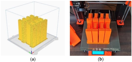 A gyroid lattice was generated using Matlab (The Math Works, R2020b) and imported separately into Ultimaker Cura 4.8.0, the program used to set up the test sample to be 3D printed, where Prusa i3 Mk3s (Prusa Research, Prague, Czech Republic) (Figure 6) was selected as the 3D printer. The test samples were set to contain a gyroid infill, and the density (λinfill) was varied to study how this affects the mechanical behavior of the structure. Hence λinfill depends on the case study. As the cuboid and the plates were imported as two separate models, the cuboid infill density was set to the specific percentage being studied, whilst the plates always had an infill density of 100%. In addition, the shell setting was used to modify the model wall thickness, by treating both models separately. The cuboid model was set to have no wall count for both the bottom and top layers. On the other hand, the plate model was set to have a wall count of 1 with a wall thickness of 0.8 mm. The printing settings used with the Prusa i3 Mk3 are shown in Table 3.