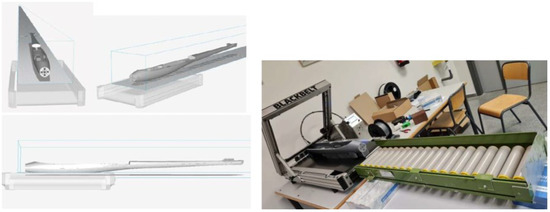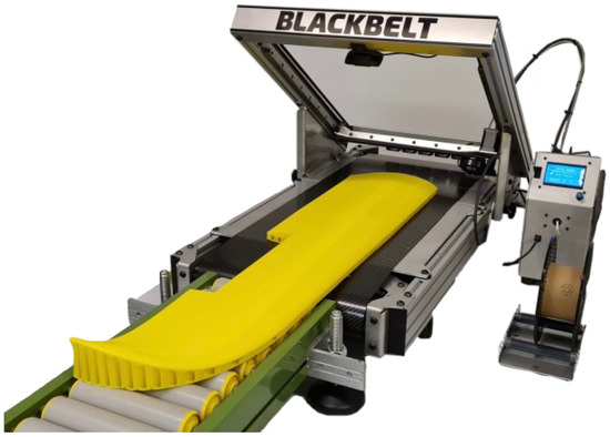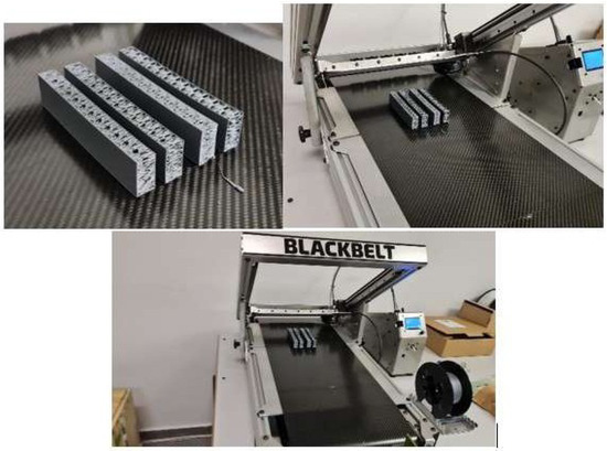 Another variable that was studied along with the infill density was the printing filament angle. To study this, the Blackbelt 3D printer (Blackbelt 3D B.V., Belfeld, The Netherlands) (Figure 7) was used, as it allows for printing under various nozzle angles. This is a continuous turning belt base printer that is able to produce series by printing individual models continuously or by producing very long parts. As this printer has the characteristic of infinite Z print, BlackBelt Cura 3.6.2 was used to slice the samples for this printer. This software is a version of Cura specially programmed for the Blackbelt printer. The main difference in the setup process is the explicit specification of the printing angle.