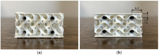 3D printed specimens with gyroid in both directions - X direction (a) and Y direction (b) and inserted CFRP rods with a diameter of 1.5 mm and length of 150 mm. Dimensions (mm) of the CFRP rods locations are shown.