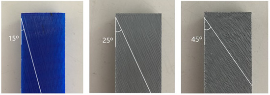 To perform the third test, the procedure was exactly the same as that for the second test. However, in this case, λinfill = 15%. Four specimens were printed in each direction, X and Y, and were tested with and without CFRP rods, with a total of 16 specimens therefore printed. The fourth test studied the variation in the printing angle, θp. In this case, the software BlackBelt Cura was used to specify the printing settings. Throughout the test, the parameters of all the specimens were kept constant, except for the printing angle, which was studied for θp = 15°, 25°, and 45°, as shown in Figure 10. The infill density of these specimens was 15%. The addition of CFRP rods supposed an increase in mass of 10.8%, high enough to be considered as a design factor.