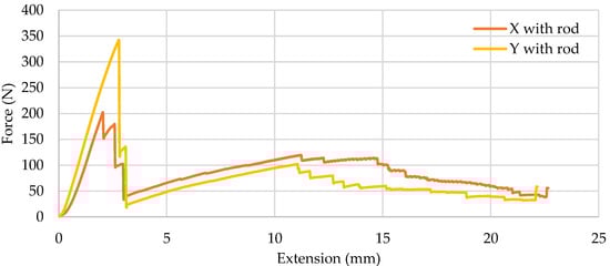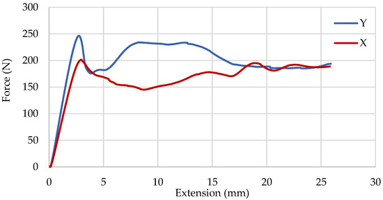 Those specimens printed in the X direction reached their yield limit at a greater force, which means these specimens had a greater yield strength. Further, the deformation of the specimen at the elastic limit was approximately the same for both cases; it occurred at about 3.8 mm. From that point onwards, the specimens continued deforming without reaching the breaking point. This occurred due to the 0° printing direction, as the strength contribution from the filaments did not depend on the quality of the joint between the filaments. This printing angle represented the deposition of filaments along the principal stress lines which, as will be seen in this section, improved the anisotropic limitation of the conventional layer-based MEX.