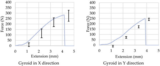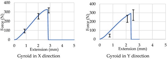 The first test performed was for the samples with λinfill = 9.5% and θp = 0°. Average values were calculated from the results obtained for both directions of the gyroid infill, which are shown in Figure 12.