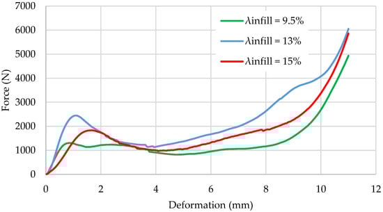 The first test performed was for those samples where the variations in the infill density were studied under compressive forces for λinfill = 9.5%, λinfill = 13%, and λinfill = 15%. It can be seen that the specimens underwent a deformation with a similar pattern for different infill densities, reaching a small peak at the start where the elastic region ended. Then, the specimens started to deform plastically, reaching a point where the infill gyroid structure was fully collapsed at about 9 mm of deformation, and the load applied tended to infinity with nearly no deformation. However, this last part was cut from the graph, as it is not valuable to the purpose of the research; the plot was kept between the range of values that could be reached during a real situation [27].