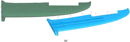The wings are reinforced with two tubular rods with an external diameter of 8 mm and a thickness of 1 mm. The other rod is a tube with a diameter of 15 mm and a thickness of 1 mm. In both cases they are made of high modulus carbon fiber whose mechanical characteristics are described in [14]. The numerical simulation of the mechanical behavior is shown in Figure 22. The finite element analysis (FEA) model has five meshes, one tetrahedral (four nodes) of size 15 mm and four one-dimensional meshes that model each of the tubes that reinforce the wing. The tetrahedron mesh is formed by a total of 135,381 nodes and 81,426 elements. The results do not change significantly with lower element size. It is considered that the wing works with a fixation in its central end and that it has a uniformly distributed load on the wing surface of 5 kg in each wing. This load is considered to be much higher compared to the one that will withdraw the wing under normal conditions. It is calculated with a safety index of 2.5, considering that the most critical moment of the flight is the impact with the ground at the time of landing.