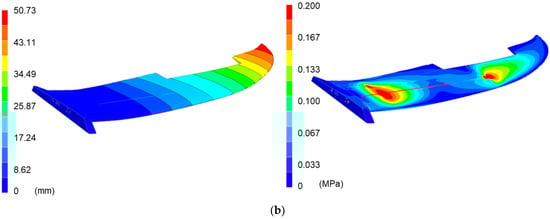 Wing finite element mesh and applied loads (a). Wing displacement and von Mises stress; mm and MPa (b).