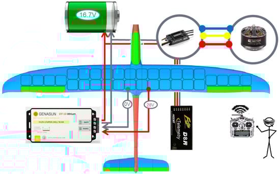 During the plane mission, the point where the maximum power is achieved is variable. For this reason, it is important to use a device that monitors these data and defines the percentage of energy that is used to generate voltage and how much energy is used to generate current. The product of both (VxI) generates the maximum possible power and supplies the maximum amount of power to the aircraft’s propulsion system or battery. The maximum power point tracker (MPPT) regulator is commonly used with wind turbines and solar photovoltaic (PV) systems to maximize energy extraction in all conditions. Although it is applied mainly to solar energy, the principle is generally applied to sources with variable power: for example, optical and thermo-photovoltaic power transmission. The main problem addressed by the MPPT is that the efficiency of the transfer of energy from the solar cell depends on the amount of sunlight that falls on the solar panels, the angle of incidence of the solar light, the temperature of the solar panel and the characteristic electrical loads. The solar panels provided work at maximum efficiency at the maximum power point (MPP). MPPT devices are typically integrated into an electrical power converter system that provides voltage or current conversion, filtering, and regulation to drive various loads, including electrical networks, batteries, and motors. For this purpose, the commercial Genasun GV-10 Lithium 12.5 Volt MPPT regulator was selected. The scheme of the MPPT connections is described in Figure 25. Then, it is possible to obtain a performance even 60% greater than if the solar panels were connected directly to the electrical circuit of the UAV.