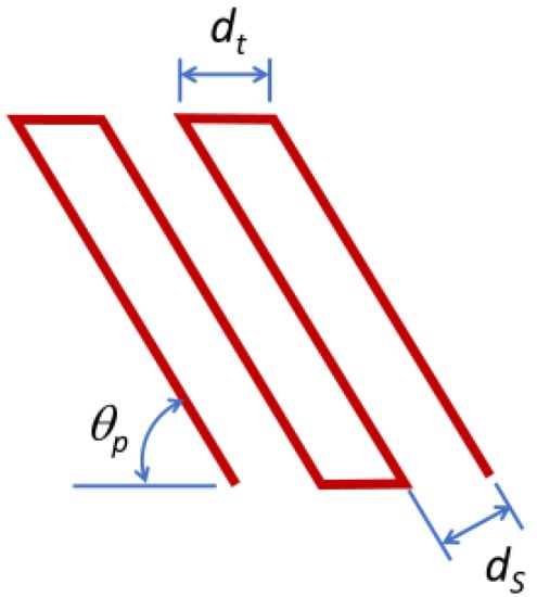 The Blackbelt printer with a nozzle angle of 45 degrees was chosen. Blackbelt Cura is programmed and developed by Blackbelt 3D and provides a new environment to work with different deposition planes. There are many open problems associated with the non-planar deposition nozzles or 45-degree nozzles. Blackbelt Cura can set the gap between layers, but this distance will correspond only to the side surfaces of the pieces printed (ds); however, due to the printing angle, θp, at the top layer, the distance between filaments, dt, will be much greater. A simplification of this situation is illustrated in Figure 26 where it can be clearly seen how dt is greater than ds. This difference in distances will mean that the filaments in the layer at the top surface will be too separated to fuse together and will therefore not be able to create a compact robust structure. The phenomenon in Figure 26 should be considered, as it will affect the final results of the wings and fuselage printed with the Blackbelt printer.
