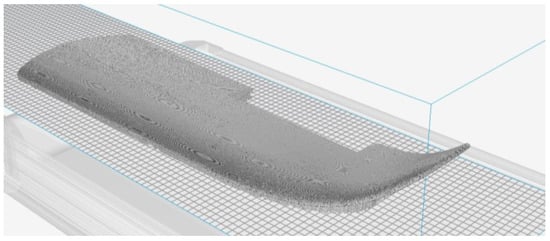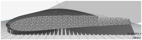 Considering the few disadvantages presented, the part was printed as described above. Its visualization in Blackbelt Cura can be seen in Figure 27 and the cross-section of the wing in Figure 28, which allows for a clear visualization of the gyroid infill. The fuselage to be printed and the partially printed fuselage can be seen in Figure 29. The results look much better than those obtained previously using a conventional 3D printing with the injection nozzle at 90º degrees.