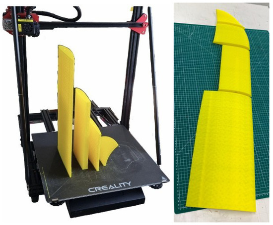 Finally, to be able to compare the structure obtained from conventional printing to a method consisting of 3D printing that uses an angle with infinite Z, the same wings were also printed with a conventional 3D printer. This wing was printed in different parts, which composed the whole wing, as conventional 3D printers print pieces upwards, and therefore they have a height limit that is established by the proper printer. In this case, as each wing had a height of 1 m, and the wing was printed in four parts, as shown in Figure 30 and Figure 31. These parts were joined together with an adhesive. Therefore, these joints will be critical bending stress points, which could fail more easily than a continuous structure, such as the wing manufactured with the Z-infinite printer, where the wing is printed as a whole part and there are no joints.
