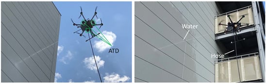 In this study, we focused on a high-pressure washing task (see Figure 1), which is one of the applications employing ATD. High-pressure washing tasks at high altitudes are usually carried out using a crane or cable-suspended gondola, and it is a very dangerous operation for the workers, with the risk of crashing [15]. Thus, it can effectively reduces accidents by replacing workers with multirotors. In order to realize the high-pressure washing task, it is necessary to generate an appropriate force to support the high-pressure washer nozzle while injecting water and to accurately inject water toward the target location. In [16], a three-dimensional hybrid kinematics-force (HKF) model for fluid force estimation coupled with position optimization of an aerial robot capable of high-pressure fluid ejection is presented. The reaction force from the water ejection is suppressed by the UAV body itself. In our case, by installing the ATD on the multirotor platform, the driving force from the ATD allows the multirotor to suppress the reaction force from the high-pressure washer and translates the multirotor by staying horizontal. A case in which a vertical propeller was added to a multirotor UAV so that it could generate horizontal force to conduct a percussion inspection was reported [17]. In our case, it requires a multirotor to generate a stable horizontal force in all directions.