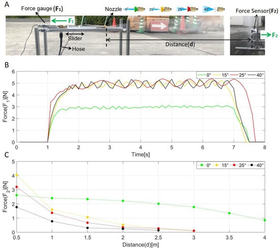 In order to design the ATD, it is necessary to check how much force will be applied to the multirotor during water injection. In addition, to determine the optimal distance between the multirotor and the washing target, the washing power of the water jet was also measured. The experimental setup of the force measurement is shown in Figure 3A and is conducted with reference to [16]. The high-pressure water pump used in the washing system is a Karcher K2 Classic with a maximum permissible pressure of 8 MPa, a discharge water volume of 330 L/h, with a motor of 1 kW. The nozzles of the high-pressure cleaner are attached with a turbo nozzle lance and are equipped with a slider that can push the force gauge. The measured force from the force gauge (, see Figure 3A) can be equal to the force acting on the multirotor. Four different types of nozzles (0, 15, 25, 40, see Figure 3A) were used for the measurements. To measure the washing force (, see Figure 3A), we set a force sensor at the same height as the nozzle. Measurements were taken while increasing the distance by 0.5 m.