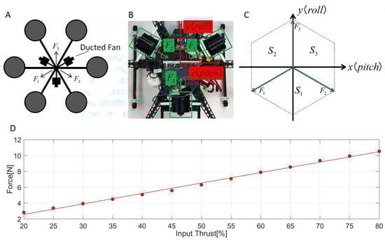 is the slope of each region in the coordination(see Figure 4C), and in our case, it is because the ducted fans are displaced by 120 degrees. The input thrust of the ducted fan with its output thrust follows , and can be defined by the following equation.