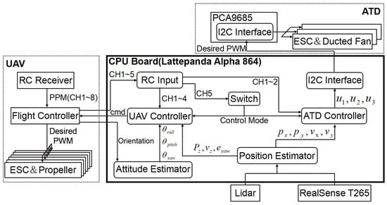 The proposed aerial robot system was constructed as shown in Figure 6. The control system of the multirotor and the ATD are designed to be operable from the RC transmitter via the onboard computer. The flight controller and the onboard computer communicate via SDK. It allows the flight status to be received from the flight controller and sends control commands from the onboard computer. Control inputs to the multirotor include roll angle , pitch angle , yaw angular velocity , throttle , and brake functions . The ATD is equipped with an I2C interface (PCA9685), which receives control input from the onboard computer and controls the ducted fans through ESC. The low level control system is constructed based on Equations (1)–(5) and is designed so that ATD control can be achieved by providing input thrust in the roll and pitch directions only (). Thus, we designed flight control modes by using the above-mentioned control inputs, and can be handled by a switch in the RC transmitter, namely normal control mode and ATD control mode. These control modes are described as follows: