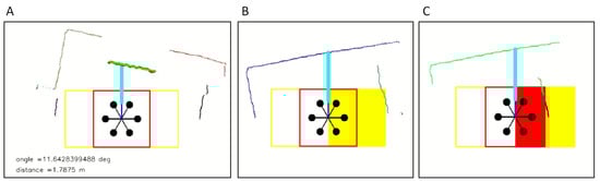 (A) Sensing result of the LiDAR. From the fitted line (green line), it shows the estimation results of the angle and the distance to the wall in front of the UAV. (B) The case of an obstacle in the ‘warning region’ (2 m × 1 m). (C) The case of an obstacle in the ‘critical region’ (1 m × 1 m).