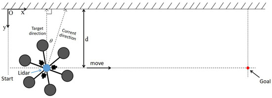 To obtain the information about the wall, it is necessary to detect and separate the wall from the obtained LiDAR data. We assume that when the algorithm starts, the wall is in front of the UAV because the operator activates the wall detection algorithm when it is actually in front of a wall and needs to be turned off otherwise. According to this assumption, segmentation is performed considering the point directly in front of the UAV as one of the points in the wall, moving to the points to the right from that seed point. By computing the distance between the neighboring points, it is decided whether to include the point in the segment or not. When a discontinuity is found, the procedure is repeated again, this time from the seed point to the points to its left. Once the visible wall segment is detected in the data, a linear least square fit is performed on the segmented data to fit a line onto it. This is assuming the detected wall segment is flat, and no other walls are connected to it in the visible range of the LiDAR data.