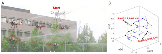 (A) Continuous image of high-pressure water injection while flying in the ATD control mode. (B) Movement trajectory of the multirotor during water jetting. The coordinates of the start and end represent (px,py,pz), and blue arrows at each measurement point indicate the direction of the UAV’s water jet.