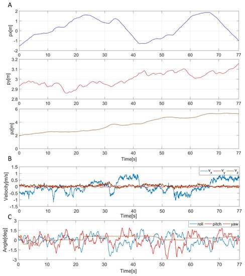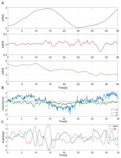 To verify the effectiveness while using LiDAR and the stereo camera as sensor feedback, we perform indoor experiments, as shown in Figure 8. The multirotor was controlled to keep a constant distance to the wall, and it was set to 1.6 m. The heading direction of the multirotor was set to stay vertical to the wall, and we operated the multirotor to move to the right (see Figure 8). In the experiment, we used LiDAR feedback at first and repeated the same experiment by using camera feedback. The experimental results are shown in Figure 9. In the case of using LiDAR (see Figure 9A), the position error was in ±0.05 m, and there was an error of about 0.05 m with the camera that took measurements at the same time. In addition, the multirotor was able to move while remaining perpendicular to the wall within an error range of about ±1 deg. The angle estimated from the IMU sensor had an error of about ±1 deg compared to the LiDAR but showed similar behavior. On the other hand, in the case of using camera feedback (see Figure 9B), the experimental results are similar to the case of using LiDAR feedback. Through the experiment, we verified that both the LiDAR and camera feedback can be used for multirotor control, and it worked as expected. Table 2 shows the pros and cons of different parameters of the two sensor systems used for testing.