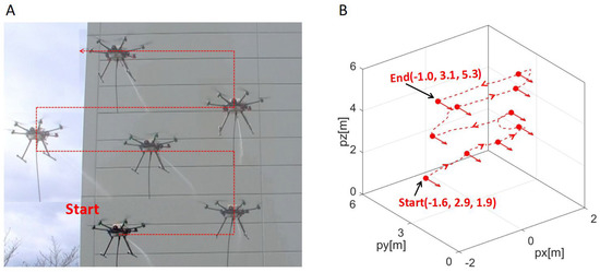 (A) Continuous images of washing tasks during flight. (B) Movement trajectory of the multirotor during the washing task. The coordinates of the start and end represent (px, py, pz), and red arrows at each measurement point indicate the direction of the UAV’s water jet.